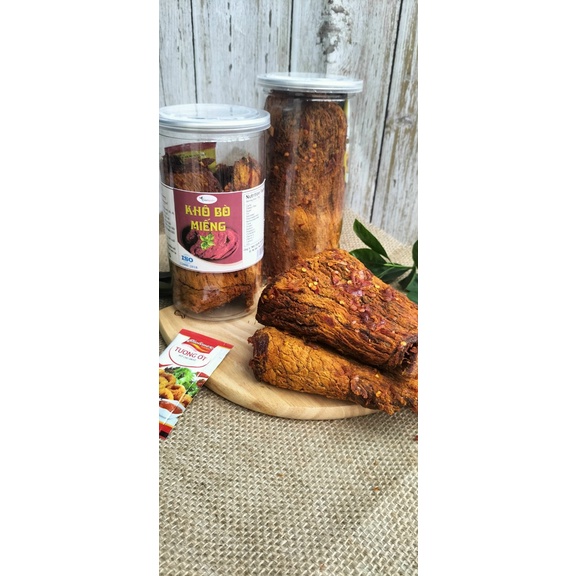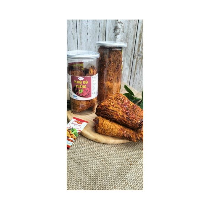 Khô bò miếng làm từ thịt bò 100% ko pha trộn đóng lon pet 200gr. Khô bò là món ăn vặt được làm từ thịt bò tươi đem tẩm ướp rồi sấy hoặc phơi khô ở nhiệt độ cao giúp món ăn giữ được lâu mà không cần bảo quản lạnh.