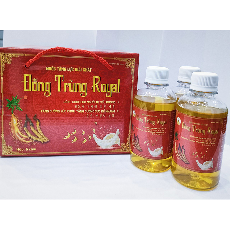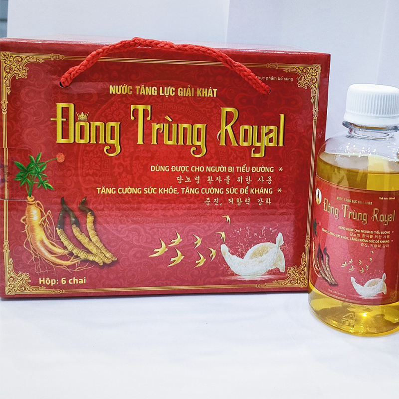 - Nước uống tăng lực giải khát ĐÔNG TRÙNG ROYAL là sự kết hợp của Đông trùng, các loại thảo dược với taurine, lysin và các vitamin giúp bồi bổ cơ thể, nâng cao sức khỏe và tăng cường sức đề kháng. Sản phẩm rất phù hợp cho trẻ biếng ăn, thấp còi, kém hấp thu. Người lớn cơ thể mệt mỏi, kém ăn, kém hấp thụ, suy nhược, người có chức năng gan thận kém, người có trí nhớ suy giảm