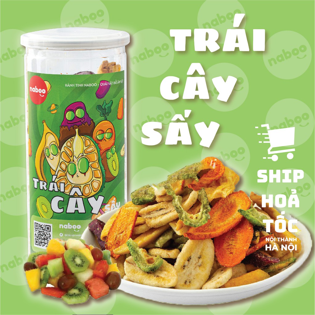 - Trái Cây Sấy Naboo Thập Cẩm đảm bảo luôn sử dụng các loại trái cây tươi ngon, được Naboo chọn lọc từ các nhà cung cấp thực phẩm hoa quả uy tín tại Hà Nội. Không như những loại trái cây sấy khác, Naboo chế biến các loại trái cây nguyên miếng, vừa dày vừa to nên khi được sấy khô sản phẩm chỉ bị teo lại một chút, không thay đổi quá nhiều so với kích thước ban đầu nhưng vẫn giữ được độ giòn tan trong miệng.